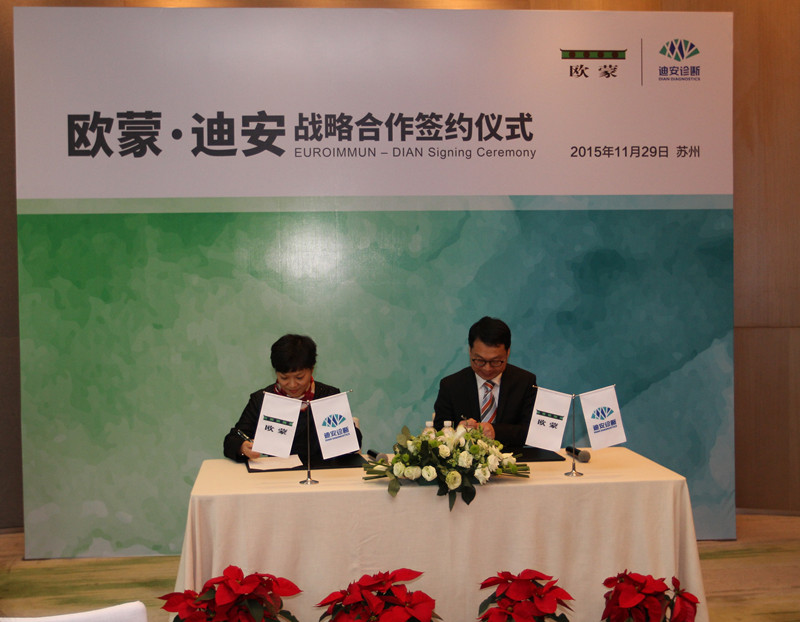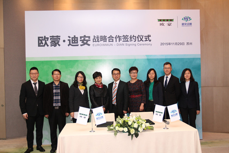 2015年11月29日,歐蒙中國集團副總裁、歐蒙南亞及東亞集團總裁李川先生與迪安診斷副總裁徐敏女士簽署了長期戰略合作協議,在未來三年中,雙方將重點致力于建設自身免疫性疾病、感染性疾病和變態反應性疾病的特色診斷項目檢測平臺。歐蒙中國以其獨特的技術優勢、卓越的產品和與國際接軌的疑難樣本驗證服務與迪安診斷完善的醫學診斷服務網絡、齊全的檢測項目技術形成優勢互補,雙方將共同推廣新項目,通過為基層醫療工作者定制的系列培訓來提升該類特色診斷項目的認知度,有效提高該類疑難病例的診斷能力與水平,從而最終造福廣大基層患者。