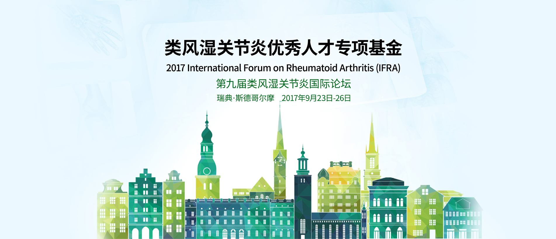 第九屆類風(fēng)濕關(guān)節(jié)炎國際論壇(IFRA)將于2017年9月23日-26日在瑞典斯德哥爾摩舉行,屆時將有來自亞洲、美國、歐洲等地的國際一流專家共聚一堂,對類風(fēng)濕關(guān)節(jié)炎的相關(guān)基礎(chǔ)與臨床進(jìn)行最前沿的學(xué)術(shù)報告和研討。