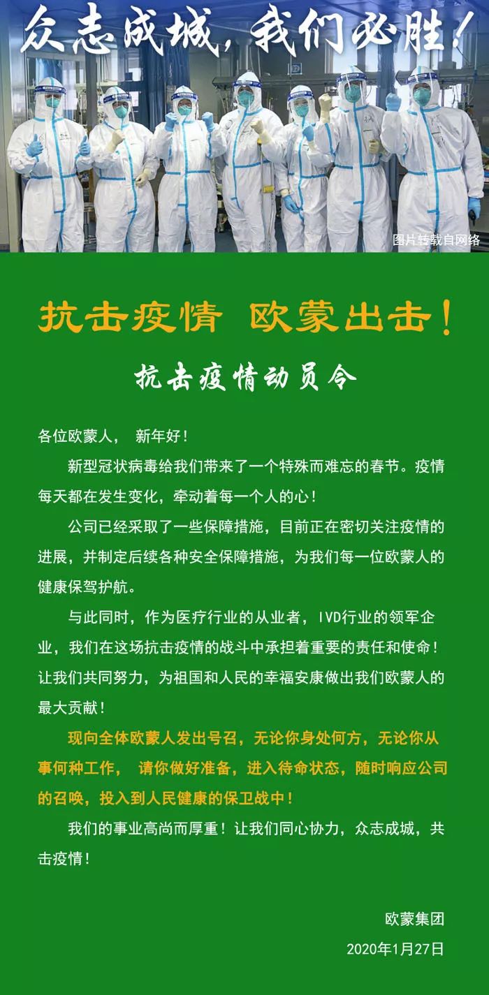 2020年的春節(jié),因?yàn)橐粓?chǎng)新型冠狀病毒肺炎的傳播,讓很多人的春節(jié)假期因此改變。自疫情發(fā)生以來(lái),歐蒙一直都保持著高度的關(guān)注,面對(duì)疫情快速響應(yīng),在第一時(shí)間成立了三個(gè)工作組,部署相 關(guān)戰(zhàn)略實(shí)施:應(yīng)急領(lǐng)導(dǎo)小組、銷服協(xié)調(diào)小組、緊急行動(dòng)小組。應(yīng)急領(lǐng)導(dǎo)工作小組第一時(shí)間將公司最新動(dòng)態(tài)與決策以最快速度傳遞到每一位歐蒙員工中,并采取各種措施保障員工的安全;銷服協(xié)調(diào)小組緊急召回部分員工,保證我們對(duì)醫(yī)療機(jī)構(gòu)的支持與服務(wù);緊急行動(dòng)小組通過(guò)對(duì)新冠病毒檢測(cè)服務(wù)與產(chǎn)品的開(kāi)發(fā),力爭(zhēng)為抗擊疫情做出更多貢獻(xiàn)。大家眾志成城、共克時(shí)艱!
