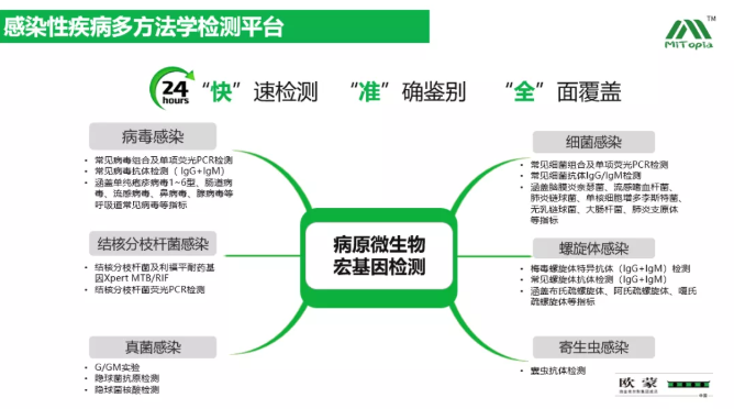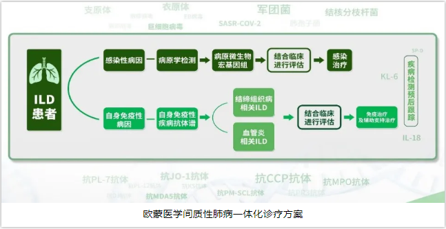 歐蒙醫學不僅可以為臨床醫生提供全面的免疫病因相關的血清學檢測項目,還可以提供感染病因相關的病原學檢測項目。周教授通過結合臨床中遇到的實際案例,為大家介紹了在間質性肺炎患者人群中識別感染、明確感染原的重要性。mNGS是目前已被臨床醫生廣泛認可的技術,在病毒、細菌、真菌以及混合感染方面都具有明顯優勢,敏感性遠遠優于傳統的診斷方法。mNGS因其具備更加快速、更加全面的進行病原診斷的特點,更有助于臨床醫生更早期的靶向治療,進而提高其生存率。除mNGS技術之外,歐蒙還可以提供多方法學、多平臺的病原體檢測項目,以及間質性肺病活動性及預后血清學標志物的檢測,以此提供更準確、全面的結果。