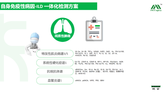 在免疫病因方面,周教授分別針對多種結締組織相關ILD(RA-ILD、SSc-ILD、SS-ILD、SLE-ILD、IIM-ILD和AAV-ILD)的臨床特點、風險因素和診治要點逐一進行了介紹,并分享了抗MDA5抗體陽性的CTD-ILD患者疾病呈現快速進展的危重案例,說明血清學抗體檢測可為臨床醫生盡早明確疾病類型及預后判斷提供詳實的依據。