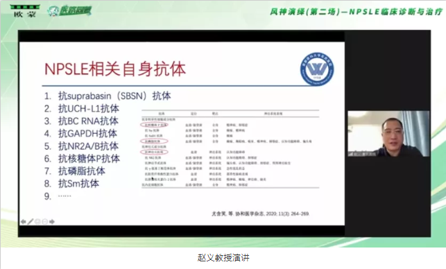 首先由首都醫(yī)科大學宣武醫(yī)院風濕免疫-變態(tài)反應科主任趙義教授給我們講解了《神經(jīng)精神狼瘡的臨床診治策略》。趙義教授指出NPSLE與SLE嚴重的疾病活動性和不良預后是密切相關的。因此我們需要對NPSLE給與高度的重視。自身抗體對于NPSLE臨床表現(xiàn)分類、預測及評估具有一定意義。尤其是抗磷脂抗體和抗核糖體P蛋白抗體都與NPSLE有著密切的關系。關于NPSLE的診治策略,可以根據(jù)神經(jīng)精神表現(xiàn)和狼瘡的遠近關系,有無非特異性的狼瘡精神性表現(xiàn)、排除狼瘡相關的干擾因素、支持神經(jīng)精神狼瘡表現(xiàn)的因素四個方面來判斷是否為NPSLE。它的治療可以圍繞著與NP相關因素的處理、神經(jīng)精神癥狀的治療、針對缺血損傷的治療、針對免疫炎癥損傷的治療這四個方面來進行。但是目前NPSLE的臨床診治方面還存在諸多問題。