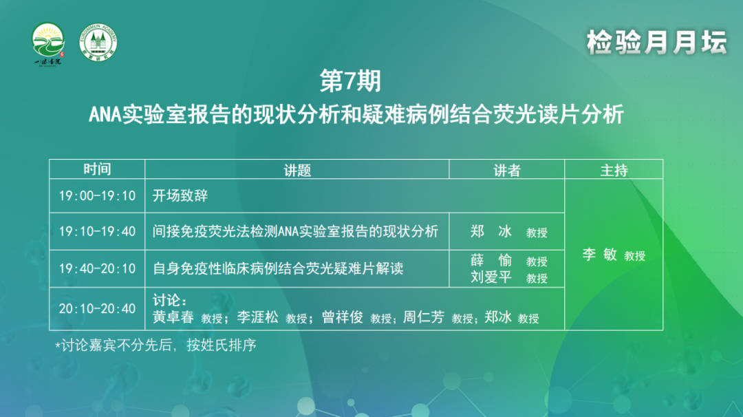 會議開場,李敏教授表示非常榮幸能夠參與第七期檢驗月月壇,同時非常感謝歐蒙公司提供了這個平臺,讓各位檢驗與臨床同道一起探討自身免疫性疾病相關實驗室診斷方法的新技術和新共識。目前,間接免疫熒光法檢測抗核抗體(ANA)仍是美國風濕病學會、歐洲自身免疫標準化促進會等專業學會推薦的參考方法,也是自身免疫病相關自身抗體篩查的金標準。本場會議邀請了多位具有一線實操經驗的檢驗專家及豐富診療經驗的臨床專家共同參與,希望進一步加深臨床檢驗溝通交流,更好地服務于患者。