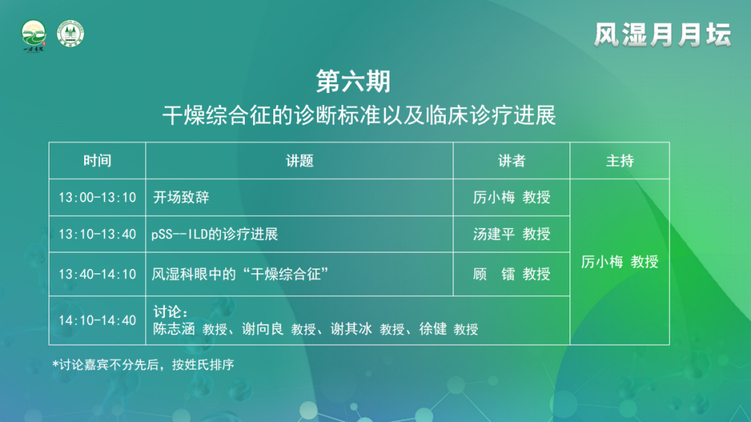 2022年11月25日,由一味書院主辦的《風(fēng)濕月月壇(第6期)——干燥綜合征的診斷標(biāo)準(zhǔn)以及臨床診療進(jìn)展》于線上成功舉行。本次論壇由中國科學(xué)技術(shù)大學(xué)附屬第一醫(yī)院厲小梅教授擔(dān)任大會主席,同濟(jì)大學(xué)附屬同濟(jì)醫(yī)院湯建平教授、江蘇省人民醫(yī)院顧鐳教授作為講課嘉賓,福建省立醫(yī)院陳志涵教授、馬鞍山市人民醫(yī)院謝向良教授、四川大學(xué)華西醫(yī)院謝其冰教授、昆明醫(yī)科大學(xué)第一附屬醫(yī)院徐健教授作為本次大會的討論嘉賓。