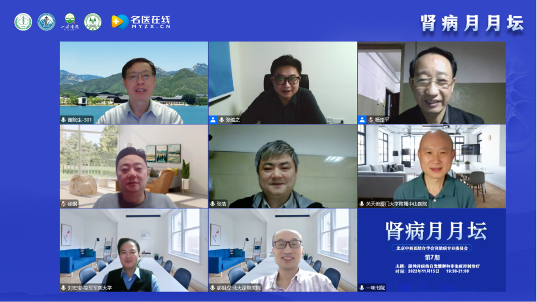 2022年11月15日,由北京中西醫結合學會腎臟病專業委員會舉辦的《腎病月月壇(第7期)——膜性腎病的自發緩解和非免疫抑制治療》于線上成功舉行。本次論壇由北京中西醫結合學會腎臟病專業委員會主任委員、解放軍總醫院第一醫學中心謝院生教授擔任大會主席,北京中醫藥大學東方醫院張勉之教授、武漢大學人民醫院楊定平教授作為講課嘉賓,華中科技大學同濟醫學院附屬同濟醫院徐鋼教授、中南大學湘雅三醫院張浩教授、廈門中山醫院關天俊教授、空軍軍醫大學第二附屬醫院唐都醫院劉宏寶教授以及北大深圳醫院熊祖應教授作為本次大會的討論嘉賓。