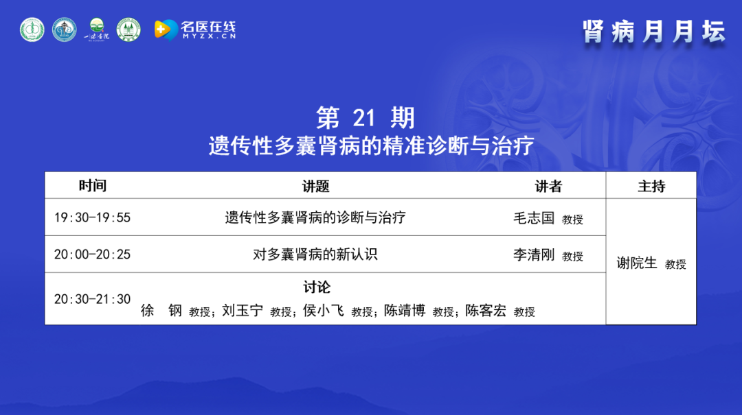 2024年1月16日,由北京中西醫(yī)結合學會腎臟病專業(yè)委員會舉辦的《腎病月月壇(第21期)——遺傳性多囊腎病的精準診斷與治療》于線上成功舉行。本次論壇由北京中西醫(yī)結合學會腎臟病專業(yè)委員會主任委員、北京中西醫(yī)結合腎臟疑難病會診中心主任、解放軍總醫(yī)院謝院生教授擔任大會主席,海軍軍醫(yī)大學上海長征醫(yī)院毛志國教授、解放軍總醫(yī)院第一醫(yī)學中心李清剛教授作為講課嘉賓,華中科技大學同濟醫(yī)學院附屬同濟醫(yī)院徐鋼教授、北京中醫(yī)藥大學東直門醫(yī)院劉玉寧教授、北京大學第三醫(yī)院侯小飛教授、臺灣高雄長庚紀念醫(yī)院陳靖博教授以及陸軍軍醫(yī)大學陸軍特色醫(yī)學中心陳客宏教授作為本次大會的討論嘉賓。