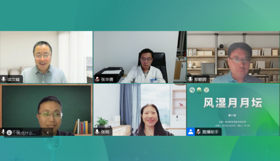 2024年5月29日,由江蘇省研究型醫(yī)院學(xué)會和一味書院主辦的《風(fēng)濕月月壇(第11期)—MDA5陽性皮肌炎的診療》于線上成功舉行。本次論壇由南京醫(yī)科大學(xué)第一附屬醫(yī)院談文峰教授擔(dān)任大會主席,江蘇省人民醫(yī)院徐凌霄教授、中國醫(yī)科大學(xué)附屬第一醫(yī)院張榕教授作為講課嘉賓,南京大學(xué)醫(yī)學(xué)院附屬鼓樓醫(yī)院張華勇教授、空軍軍醫(yī)大學(xué)第一附屬醫(yī)院鄭朝暉教授作為本次大會的討論嘉賓。