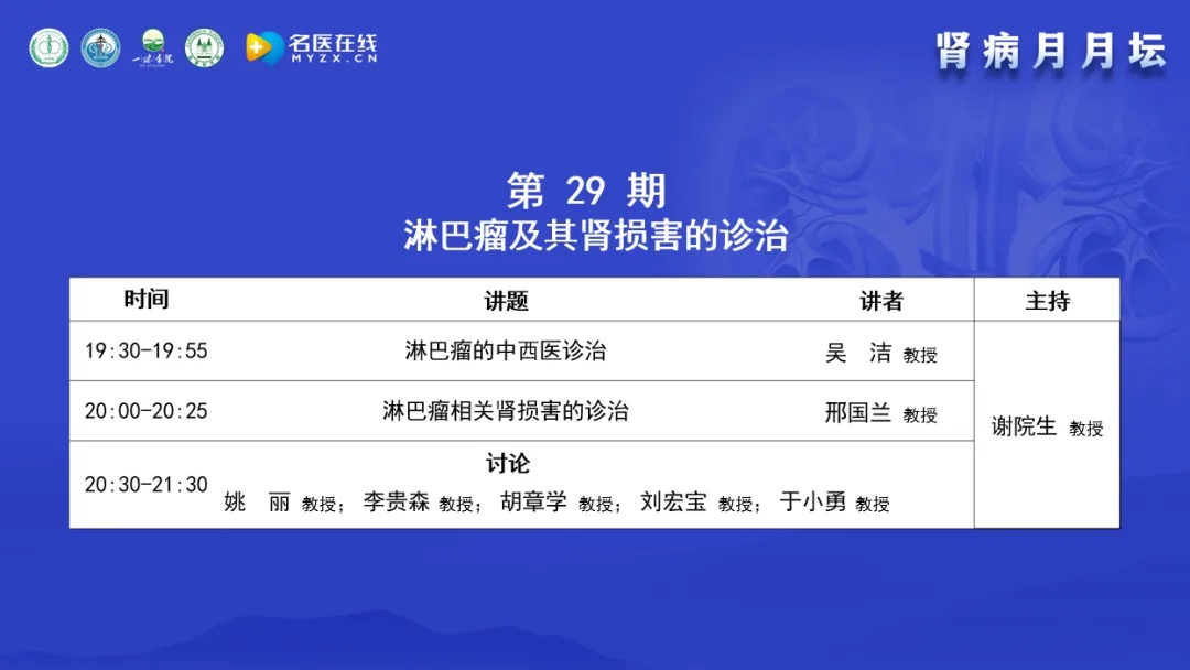 今天的主題是淋巴瘤及其腎損害的診治,很榮幸邀請到了在該領(lǐng)域有很深造詣的專家,包括血液病專家、臨床腎臟病專家、腎臟病理專家、中醫(yī)和西醫(yī)專家,都是一線非常有經(jīng)驗的科主任,一起進(jìn)行學(xué)術(shù)講座、點評與討論。