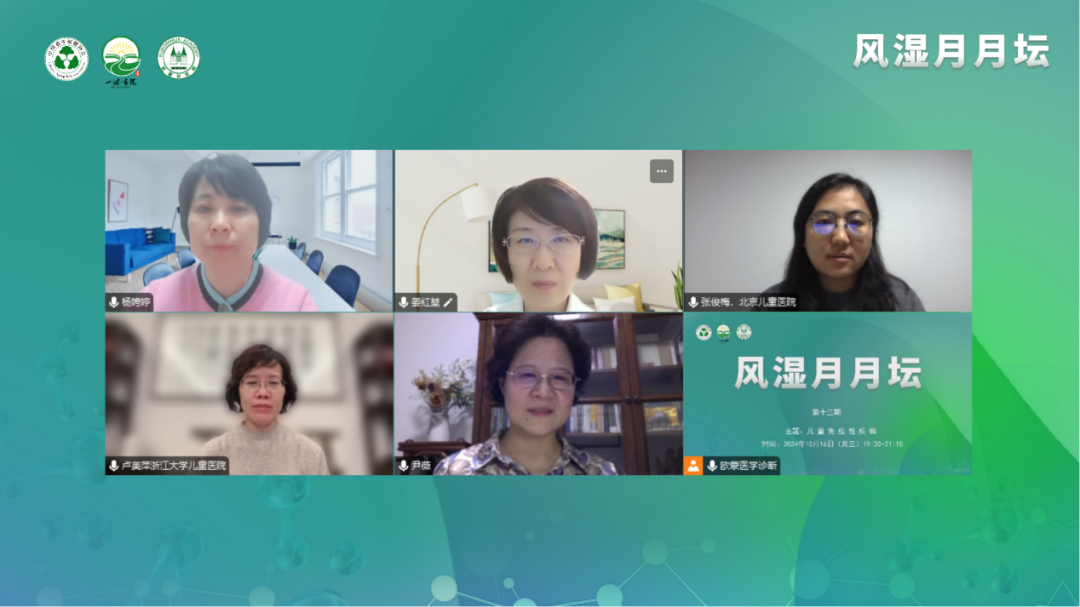 2024年10月16日(周三),由中國老年保健協會和一味書院主辦的《風濕月月壇(第13期)—兒童免疫性疾病》于線上成功舉辦。本次論壇由南中國醫(yī)科大學附屬第一醫(yī)院楊娉婷教授擔任大會主席,中國醫(yī)科大學附屬第一醫(yī)院姜紅堃教授、北京兒童醫(yī)院張俊梅教授作為講課嘉賓,浙江大學醫(yī)學院附屬兒童醫(yī)院盧美萍教授、武漢兒童醫(yī)院尹薇教授作為本次會議的討論嘉賓。