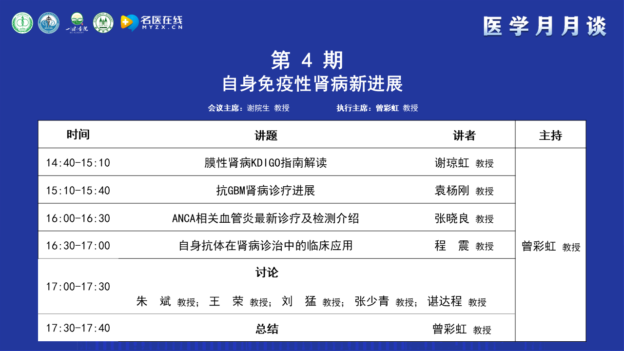 首先感謝謝院生教授精心組織醫(yī)學(xué)月月談,其次感謝四位講者為本次論壇做的精心準(zhǔn)備。本次論壇四位講者對(duì)膜性腎病、抗GBM病、ANCA相關(guān)血管炎及自身抗體在足細(xì)胞病中的應(yīng)用進(jìn)行了發(fā)病機(jī)制、診斷、治療的介紹,五位討論嘉賓對(duì)講者的內(nèi)容提出了自己的觀點(diǎn),同時(shí)也對(duì)臨床上存在的問(wèn)題和講者之間進(jìn)行了討論和交流。目前醫(yī)學(xué)月月談系列活動(dòng)共進(jìn)行了30多期,期盼后面的內(nèi)容更加精彩。