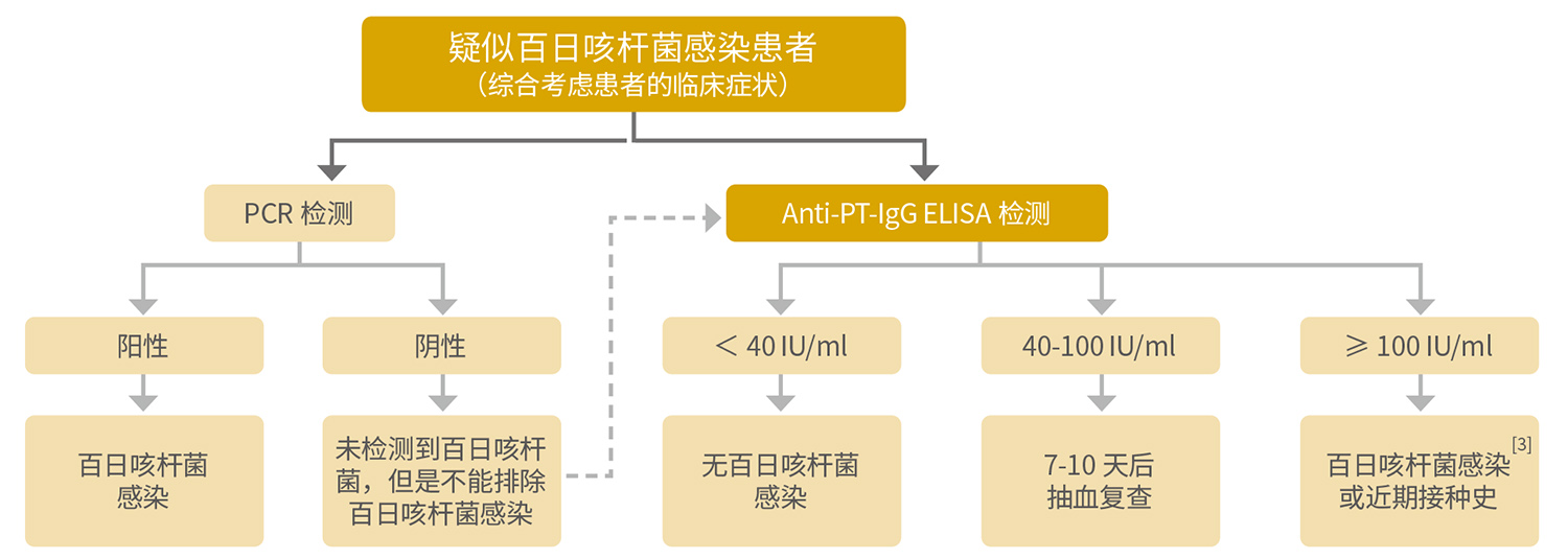 全球百日咳計(jì)劃(Global Pertussis Initiative,GPI)建議及《中國兒童百日咳診斷及治療建議》均按照不同的年齡段給出推薦的百日咳臨床診斷標(biāo)準(zhǔn)和實(shí)驗(yàn)室檢測方法。其中《中國兒童百日咳診斷及治療建議》增加了在兒童各個(gè)年齡段,均可通過發(fā)病初期與恢復(fù)期雙份血清PT-IgG滴度出現(xiàn)顯著升高(>2~4倍)進(jìn)行診斷。