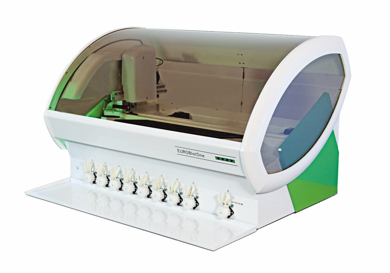 EUROBlotOne是一款緊湊型桌面設(shè)備,提供免疫印跡檢測(cè)所有流程的全自動(dòng)操作,實(shí)現(xiàn)從樣本識(shí)別、樣本稀釋、全自動(dòng)加樣、所有孵育及清洗過(guò)程,到自動(dòng)成像、圖像分析與處理的全自動(dòng)操作,最終的檢測(cè)結(jié)果分析由EUROLineScan印跡法判讀軟件完成,檢測(cè)結(jié)果可由EUROLineScan直接定制圖文報(bào)告,也可直接連接LIS或EUROLabOffice進(jìn)行信息化管理。設(shè)備大幅度提高免疫印跡檢測(cè)的工作效率,實(shí)現(xiàn)全部操作的標(biāo)準(zhǔn)化。